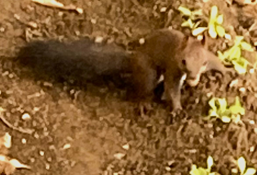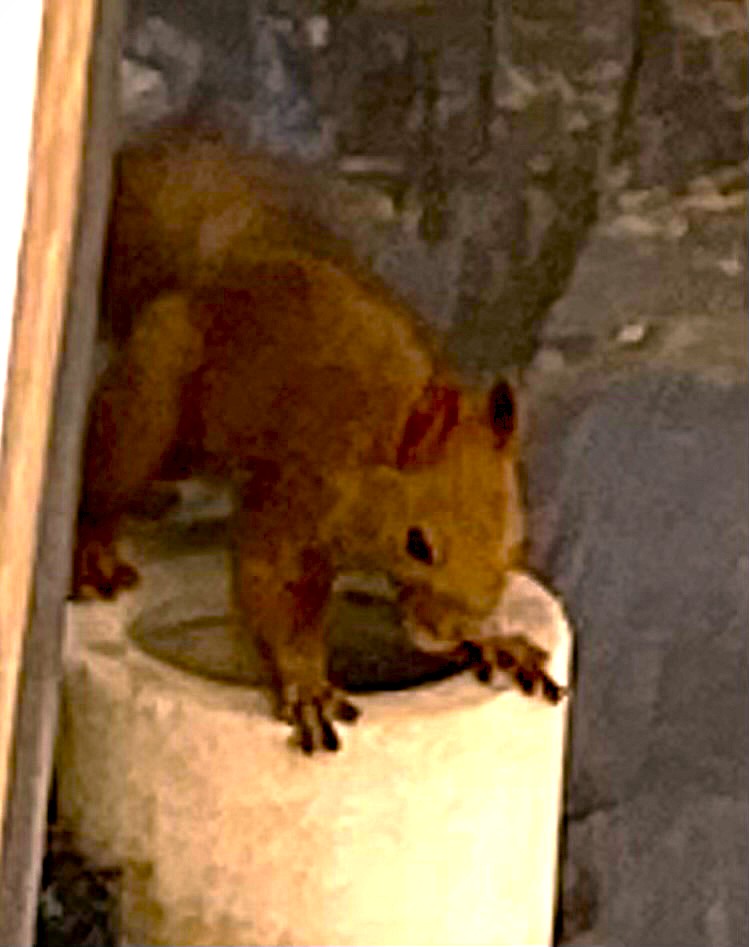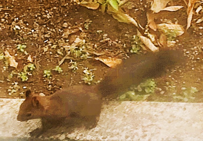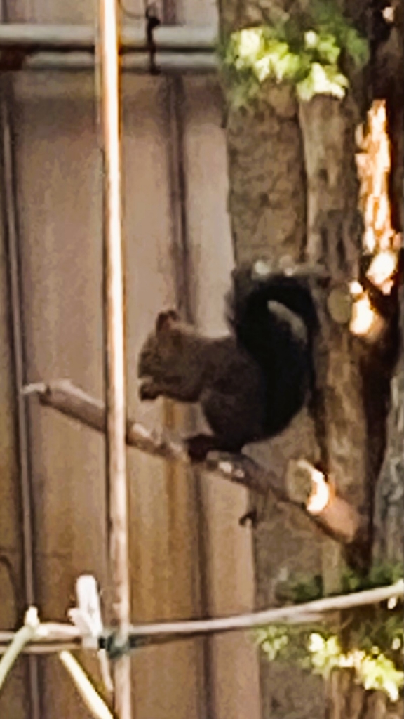 2025.9.28 日曜の昼下がり わが家の居間で 妻が属するセルグループ 「オリーブ」の皆さんが 団らんしている時 メンバーさんの御一人が わが家の今の窓越しに見える栗の木の枝を リスが移動するのを見つけて 「あ!!リスがいるわ!」 皆さん、外に出て接近したところ リスちゃんは 逃げることなく ジーっとみんなの方を見ていたとのこと