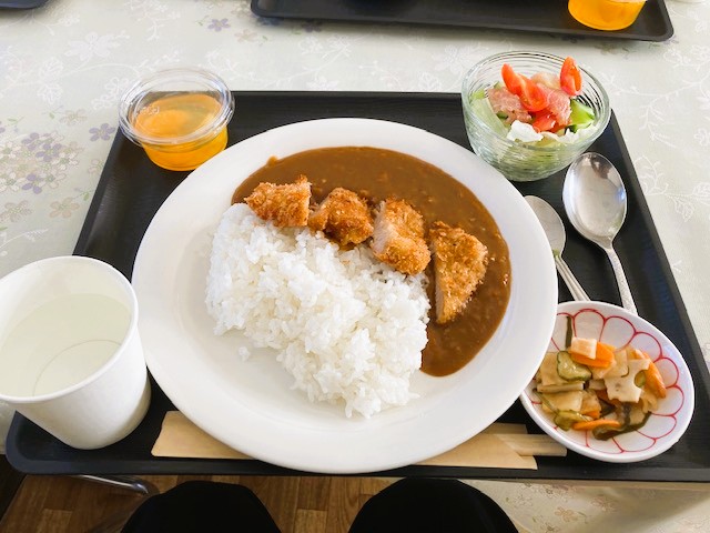 この日のメニューはカツカレー 手づくりの福神漬け フレッシュサラダ みかん、パイナップル入りのゼリー