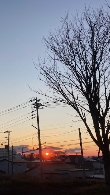 高山での枝葉の搬出を終えて 帰る時は 左手に 夕焼けが 赤々と輝いていました。