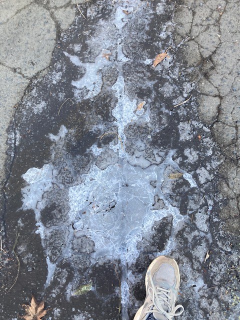 会堂にお祈りに行く時 水たまりが凍っていて 運動靴で 踏みつけて パリパリと 割れていく感触を味わい 子どものころから 同じことをやっているなあと思いました。 小さいころから 凍った水たまりがあると 踏みつけて パリパリ割れていく感触を 愉しむ習慣は変わりません。