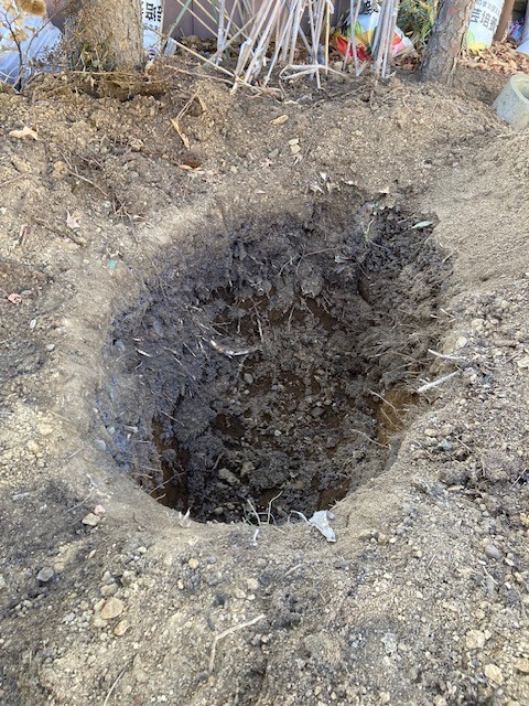 これから、落ち葉を 土の肥やしにするために 穴を掘りました。 凍土のため 腰痛バンドをつけて つるはしを 振り上げました。