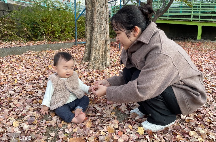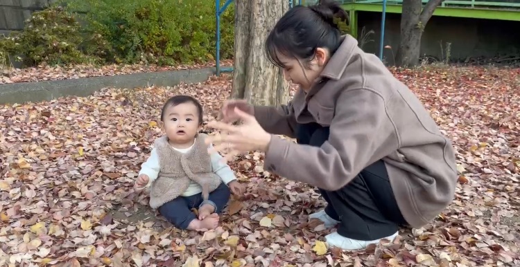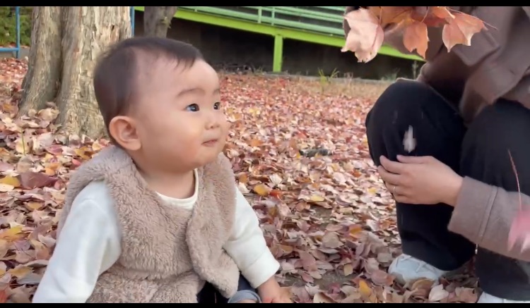 埼玉にいる 初孫が 公園の落ち葉のうえに しゃがんで 愉しんでいる写真や動画が 送られてきました。
