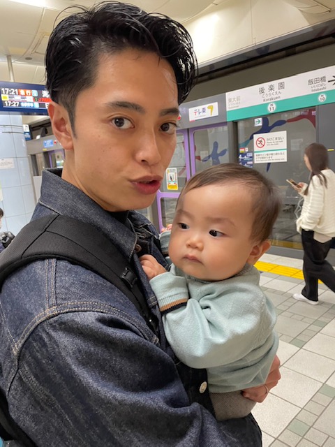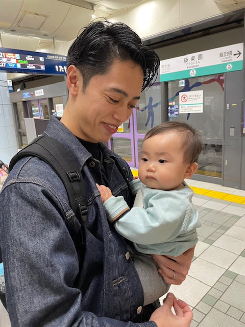 後楽園駅にて 長男と、長男の長男 見るものみんな好奇心の対象 何を見ているのかな〜?