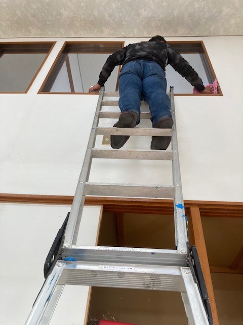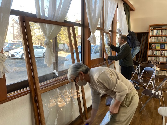 恒例の窓ガラス拭き 私たちの心の曇りも イエス様の血潮という クリーナーで 綺麗にふき取らせていただきましょう。