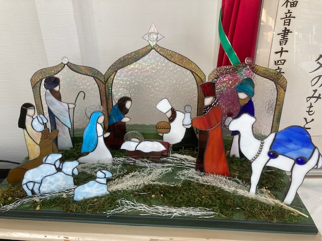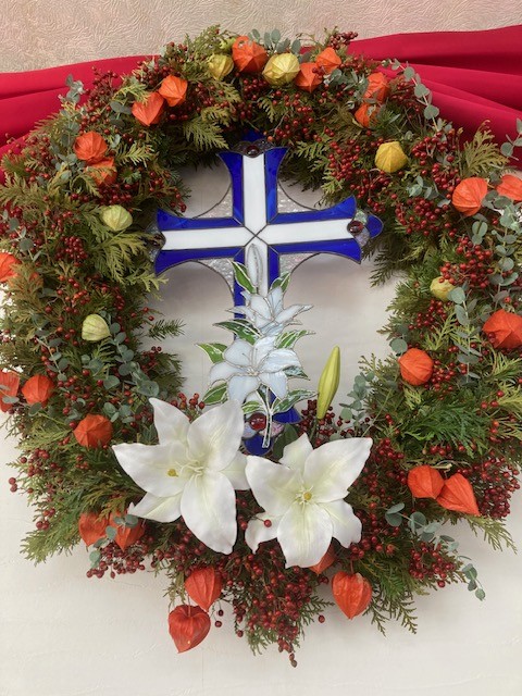 十字架はハンドメイドの ステンドグラス リースは イエス様の額につけられた 呪いのいばらのシンボル ほおずきは さしずめ 主の額から流れ落ちる血潮を 彷彿させます。
