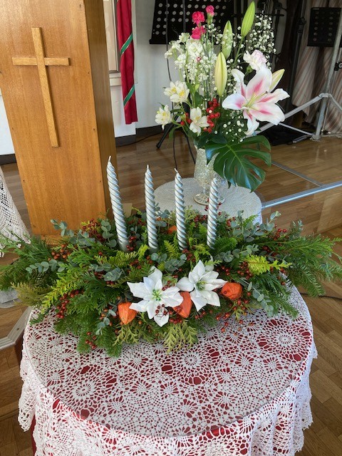教会員のAさんが ご主人と共に ひば(鶴居村のクチョロ原野で)と 松(白糠で)を 採取してくださり ユーカリと ほおずきでの アドベントクランツ