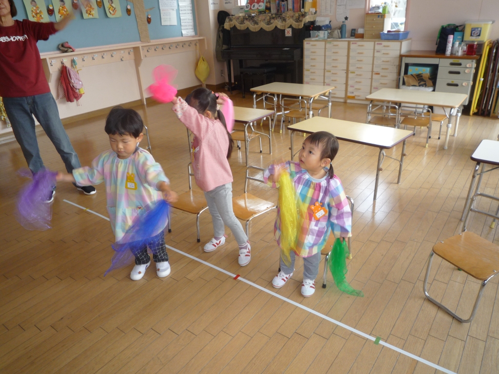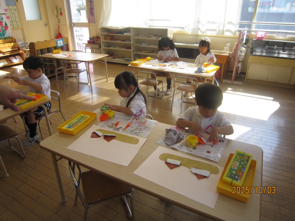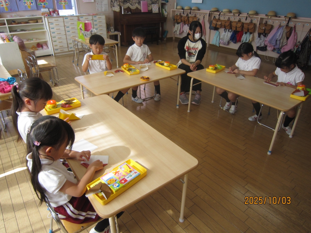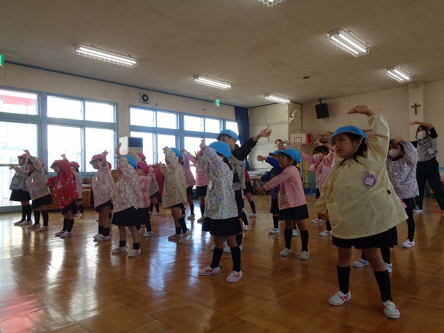 今日はお集まりをして、みんなでお祈りをして新しい神様の歌「たまもの」を覚えました♪園長先生からのお話では相手に思いやりを持つことなどのお話をしていただきました。その後は各クラスお仕事をして、横割り活動でお遊戯会の演目と曲を聴きました。みんなの気持ちが高まった様子でしたよ!