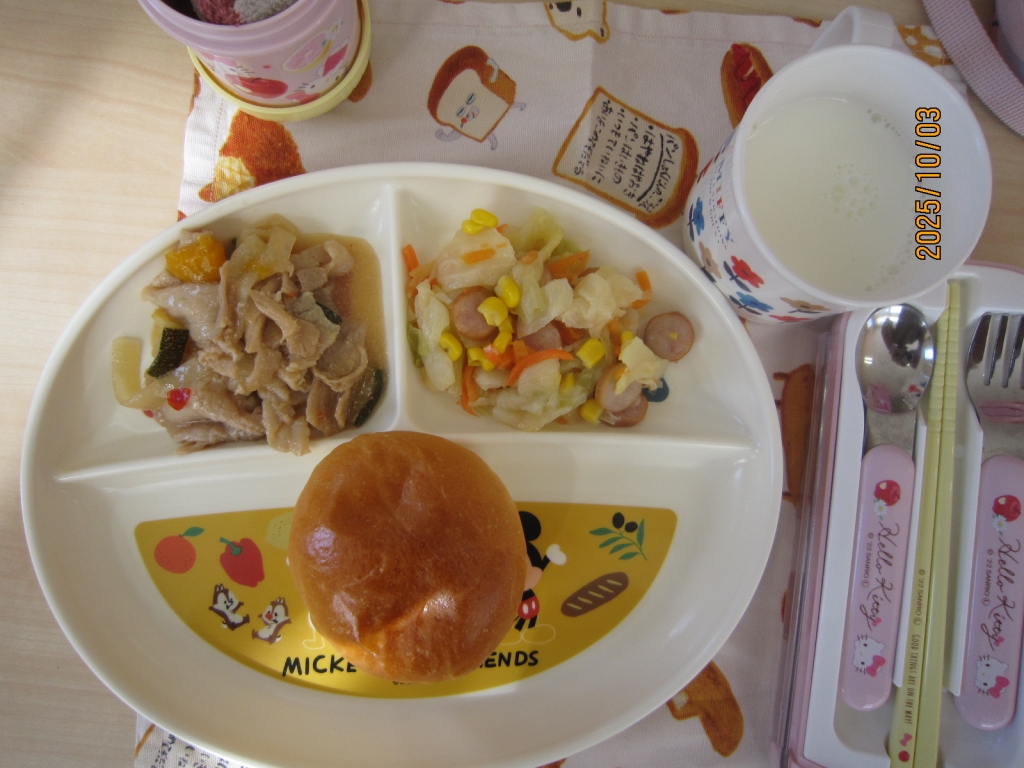 今日の給食はミニ丸パン・豚肉の南蛮風・野菜とウィンナーの炒め物・牛乳でした。