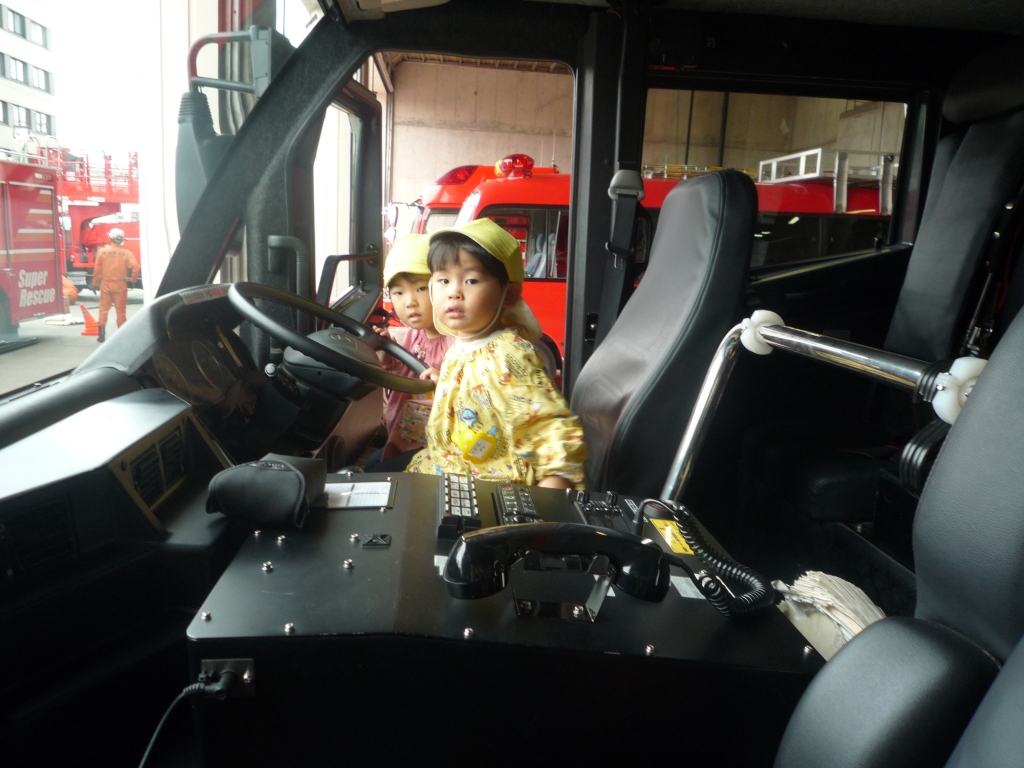 防災センターに行きました。消防車の前で記念撮影をさせてもらい、救急車の中の見学をした直後に出動要請があり出動の様子も見せていただきました。そのあとは地震体験(子どもたち震度3・大人震度7)と火事の煙避難訓練をし、DVDを見てきました。ダンゴ虫のポーズを改めて確認することが出来ました。