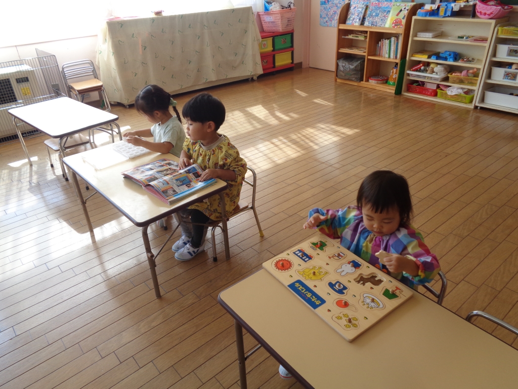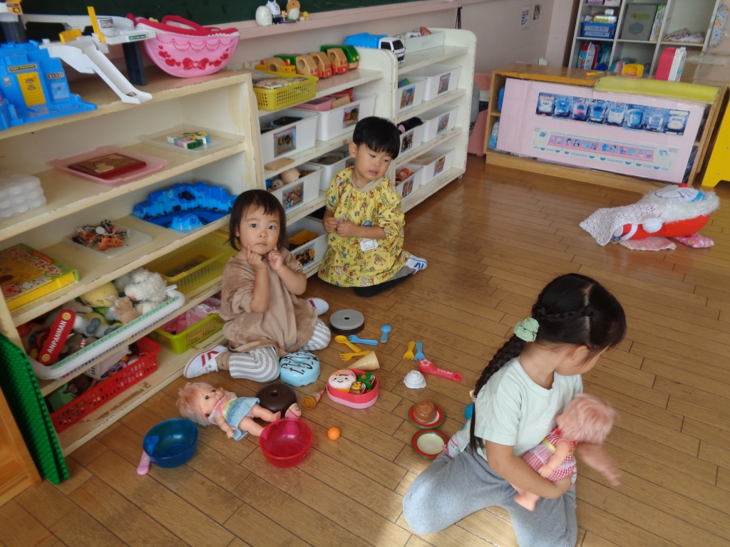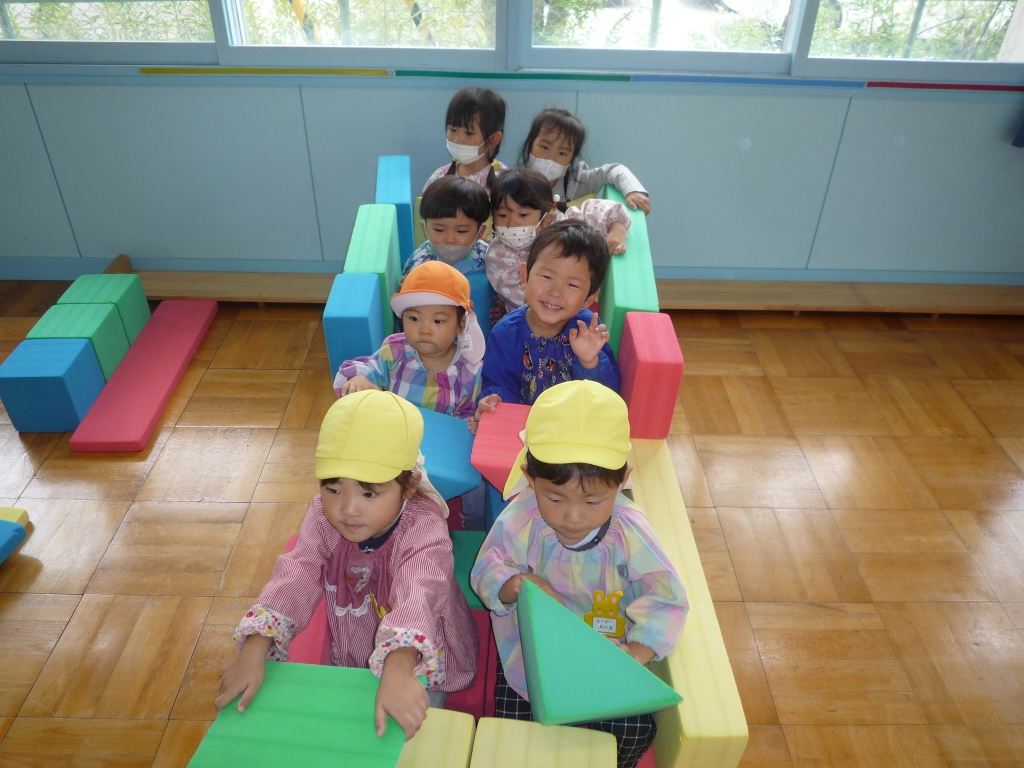 今週のたんぽぽ組の様子です。8日(水)朝の自由遊びの様子です。お兄さんお姉さんが作ってくれたカラー積み木の車に乗せてもらいました。三角の積み木をハンドルにして『ブーーーーーーン!!』と言いながら運転していましたよ🚙