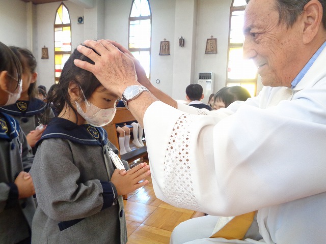 共同祈願のお友だちもとても立派にお祈りすることが出来ましたね😊 プポ神父様から、1人ひとり祝福もしていただきました。