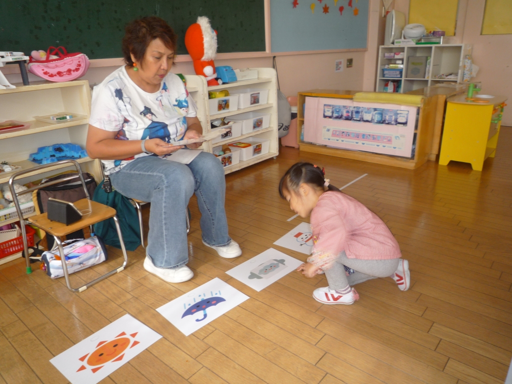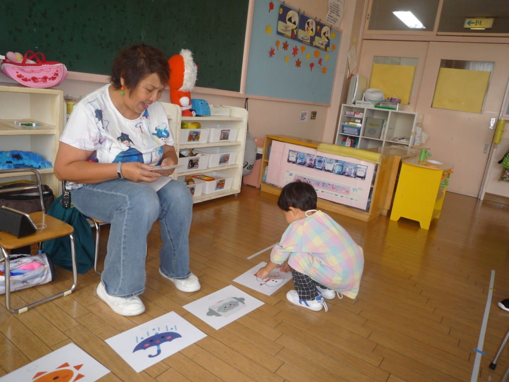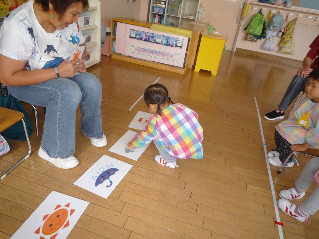 英語の時間です。天気、色を教えてもらい色々な歌に合わせて元気に体を動かしました♪