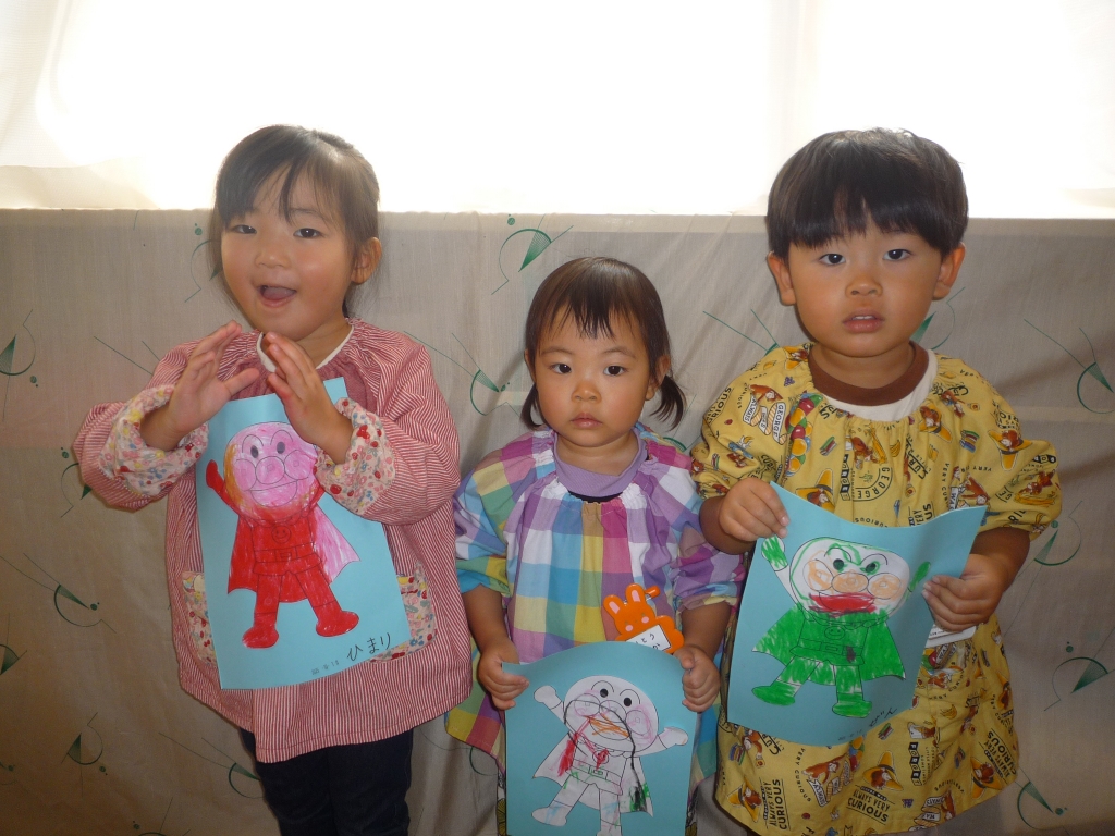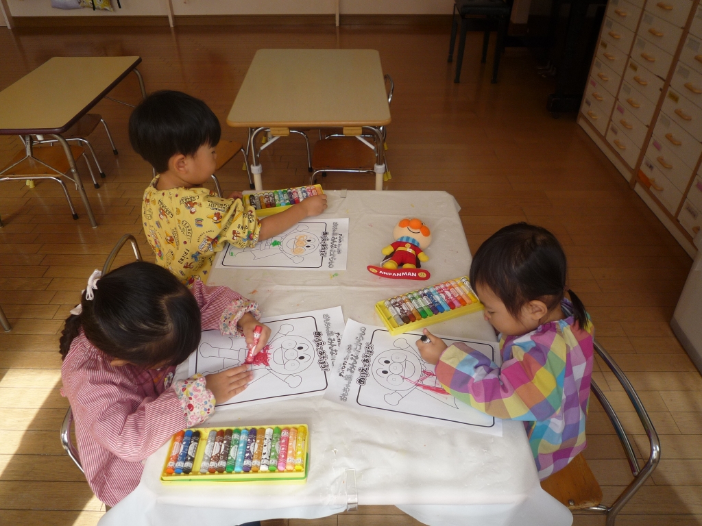 お祈りのあとは、クレヨンでアンパンマンのぬりえをしましたよ🖍個性いっぱいのアンパンマンができあがりました☺