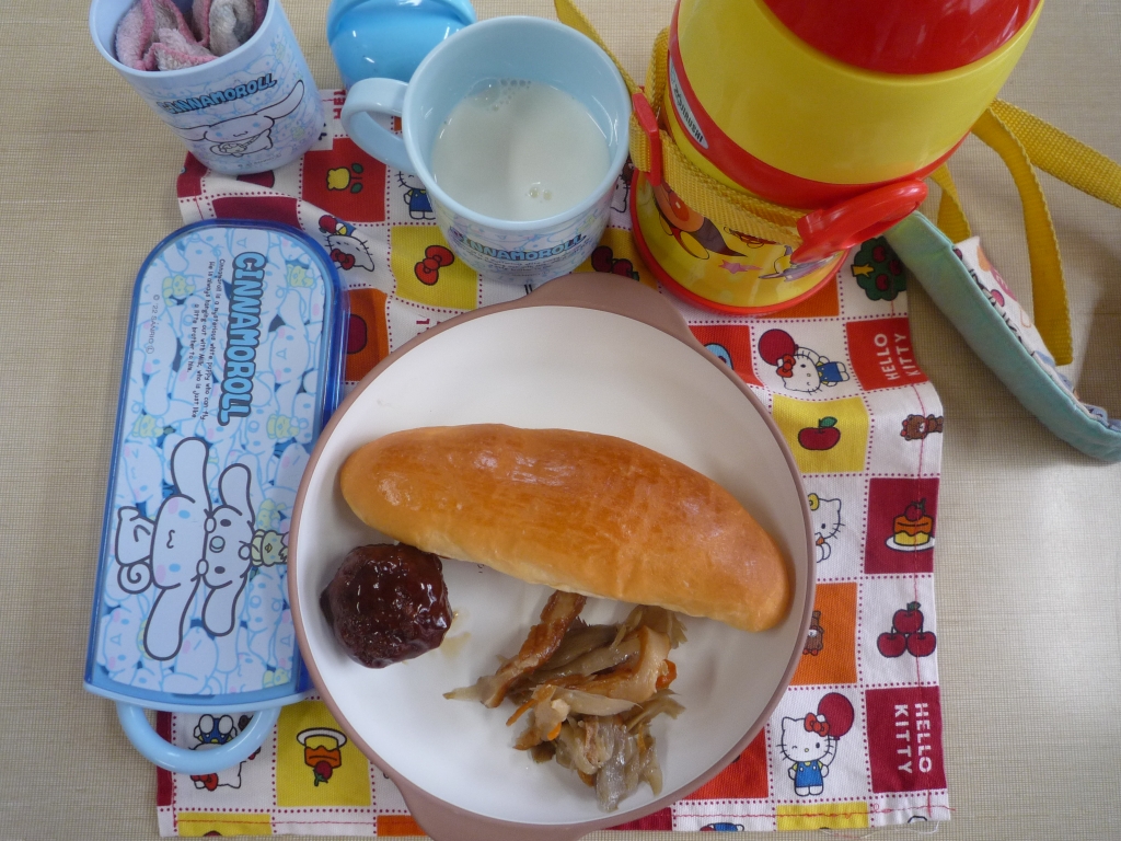今日の給食です。ミニコッペ、ミートボール、ごぼうとさつまあげのきんぴら、牛乳でした。