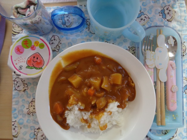 10月20日(月)給食のメニュー…チキンカレーライス・フルーツゼリーでした☆ カレーが好きなお友だちは、おかわりをしていましたよ!みんな満足満腹な笑顔でご馳走様をしていました(;'∀')