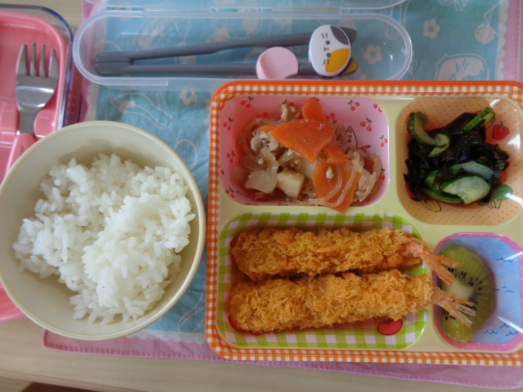 今日もお遊戯会練習をしました!練習後にはそれぞれ散歩や外遊びをして楽しみ、練習の時間は集中していました☆今日の給食はご飯・エビフライ・肉じゃが・胡瓜とワカメの甘酢和え・キウイフルーツでした。お遊戯練習を頑張ってる子どもたちは「ご飯たくさん入れてください!」食欲旺盛です!!